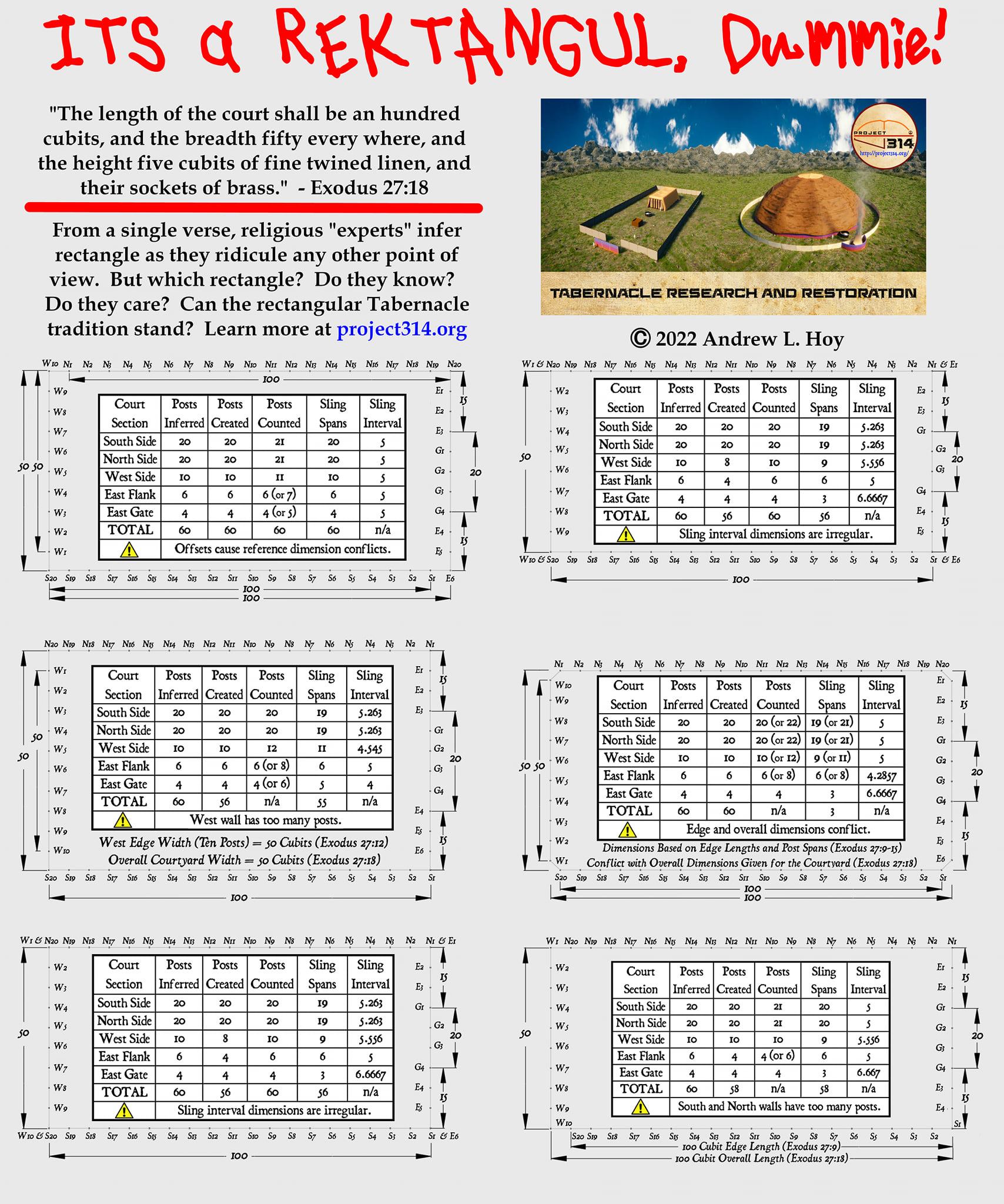 Because all Bible descriptions, measurements, and quantities must agree and not create logical contradictions, what is shown below is not quite a "biblical model", as it ALSO ignores the extra 50 by 50 term that we see in the YLT and in Hebrew original texts. Unfortunately, 119 ministries overlooked this detail that was articulated on Andrew Hoy's facebook page, where the greater focus was apparently on the critique against the "lazy" ineptitude and indifferent persons than it was seen as having introspective value, thus proving the point. There are no less than 6 different approaches or ways to interpret rectangular court post arrangements, each having its own limitation and contradiction. As published in The House of El Shaddai book and posted in the facebook excerpt above and below, the 119 CGI model conforms to option 1 of 6 as shown in the upper right hand corner of the one page rectangular court summary sheet, thus creating redundant and different measuring points given the 20 vs 21 and 10 vs 11 post count and 100 long and 50 wide respective dimensions (shown by markup of 119 ministries borrowed CGI model).