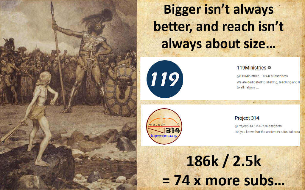 There's no question about it, 119 ministries is a well-oiled machine producing lots of popular content that appears most professional and polished with a high production quality. But bigger isn't always better; and reach and power isn't always about size. Granted, 119 Ministries is 74x bigger than Project 314. But Project 314 aims do to things differently, and opts to not only fight different battles, but to do battle in more calculated ways. Rather than saturate the world with a wide spectrum of subject matter, Project 314 is highly specialized has focused primarily on one particular niche; namely, the Exodus Tabernacle. So where the 119 ministries group has come to expand its sphere of influence by diversification of subject matter and to address everything from soup to nuts to the kitchen sink, Project 314 aspires to prioritize quantity over quality.