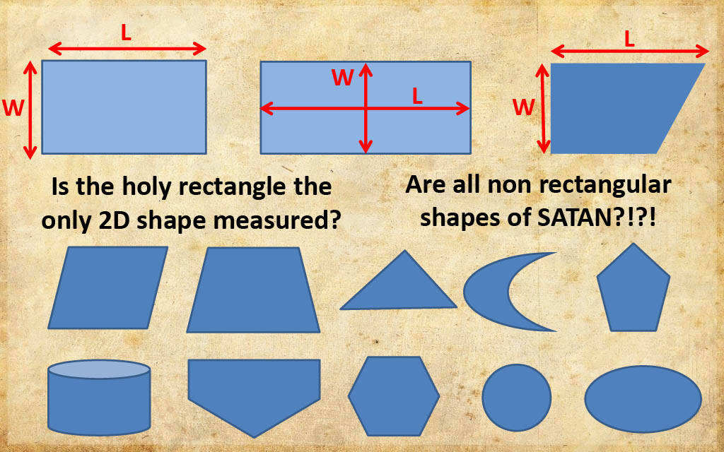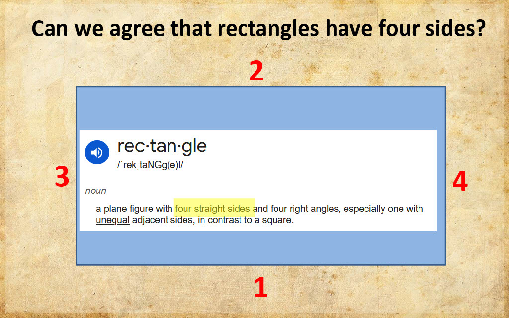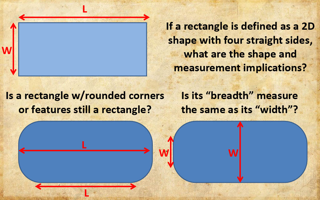 Before declaring that the "Tabernacle is a rectangle", it's first essential to define the criterion whereby a rectangle is accurately defined. Rectangles are planes with four straight sides and right angle corners. Every rectangle claim throughout the 119 ministries presentation is based on inference or presumption.