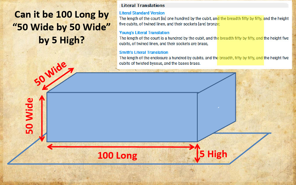If two "width" directions are specified in the literal Exodus 27:18 text, they must be accounted for in some physical way. A round court made with two halves measure 50 wide seems to offer the best explanation, whereas a cuboid prism measuring a length of 100 long by 50 wide by 50 wide by 5 high would have four dimensions, and might need to be translated in a way as depicted below. Conversely, two courtyard halves comprised of semi circles could very easily account for the 50 by 50 width language.