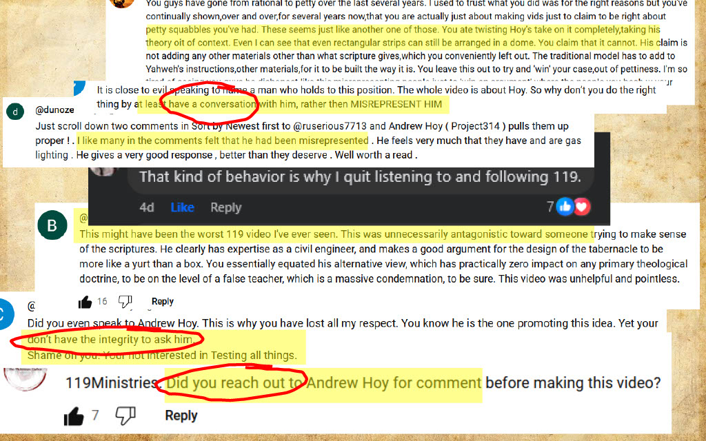 Multiple witnesses on 119 ministries YouTube channel testify to misrepresentation, and have done so since not only after 119 ministries "Was the Tabernacle a Circle" video went live.