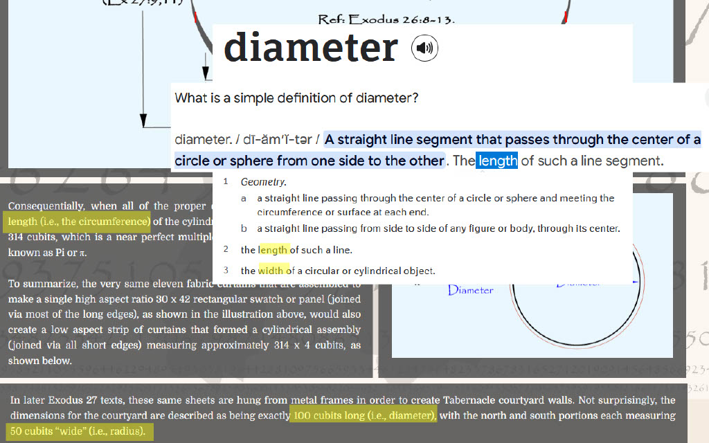 The slide below shows how DIAMETER and LENGTH and WIDTH are interrelated in the English language per basic dictionary definitions, and how Andrew Hoy / Project 314 has used the terms, along with radius and circumference, to explain things on the project314.org website. Yet 119 ministries takes this excerpt out of context and extrapolates it in a hyperbolic way far beyond the original context. This is academically dishonest and a clear case of bearing false witness.