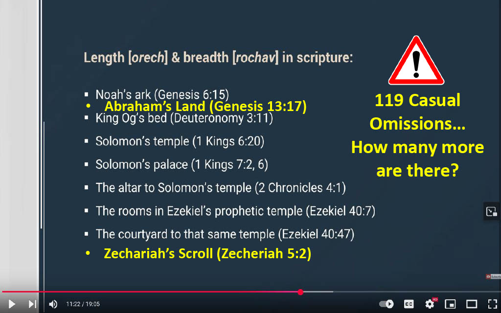 Question 24 (@2:56) -- Can 119 ministries explain why original Hebrew texts only double the linear dimension reference (the width) in one of three measurement directions, and explain why the original text doesn't say אמה באמה for length and חמש בחמשה for rise if the translators were enveloping a cuboid prisim as many of 119's English cited versions would have people believe?