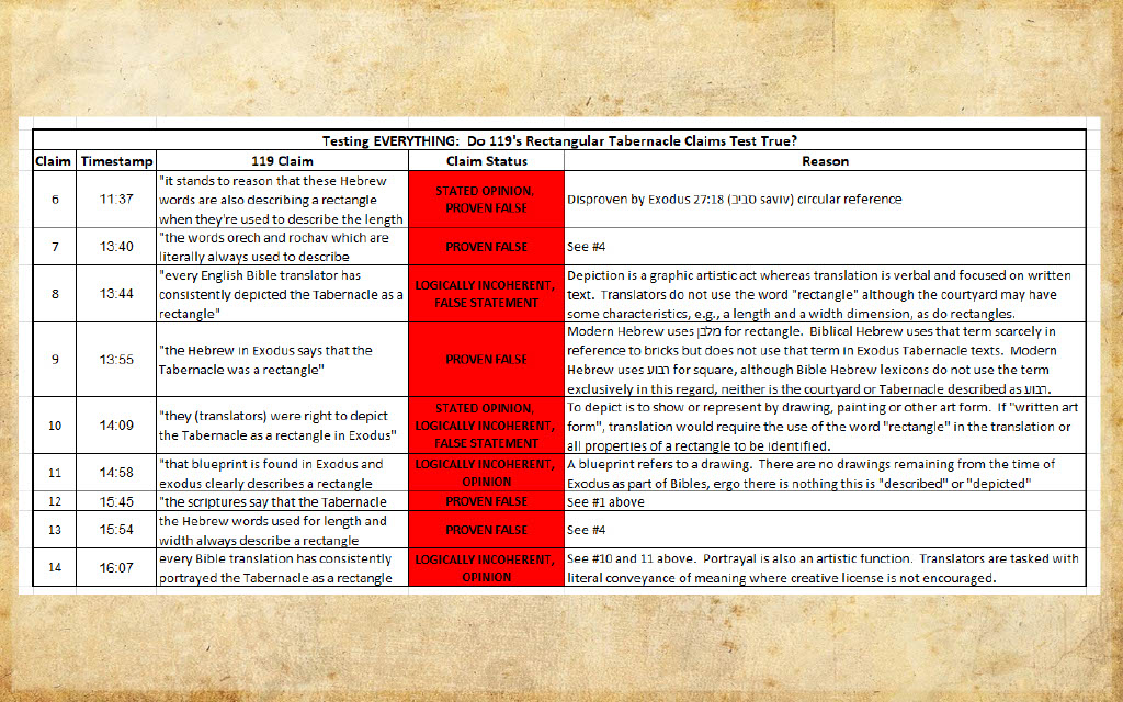 So I’m ready to take a few lumps from the bits of fumbling and verbal stumbling that I do in the response video—because in the end, all of the cuts and retakes and stitching and posturing and pandering and pretense in the world won’t change the simple truth that the 119 team doesn't t remotely understand what they are talking about in terms of Tabernacle study, are not being academically honest in either their arguments or in their conclusions. They claim that they like to test everything, but in the end, I suspect they will be exposed for failing to test almost anything.