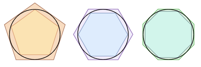 While a number of slightly different approximations of π have been used for practical purposes since ancient times, French mathematician François Viète is typically credited with perfect mathematical approximation of the constant. Like the Greek mathematician Archimedes, Viète understood that a circle’s circumference could be approximated by an infinite number of polygons inscribed inside a circle(1), as illustrated below: